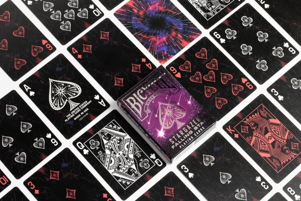 Step into a cosmic realm with Bicycle Stargazer Nebula Playing Cards. Each card in this deck of playing cards features a mesmerizing image of nebulae, with swirling gases painted on the back, turning every hand dealt into a celestial spectacle. These Poker cards glide through your fingertips, their Air Cushion Finish echoing the sensation of drifting through outer space. Encased in an alluring, nebula-themed foil tuck box, this cool deck of cards opens like a portal to distant galaxies, beckoning explorers at heart. Printed on premium Bicycle cardstock, these unique playing cards showcase an elegant blend of stellar beauty and quality. Crafted with pride in the USA, each deck of cards melds cosmic charm with high quality American manufacturing, making the Stargazer Nebula Playing Cards a universe of fun right at your gaming table.