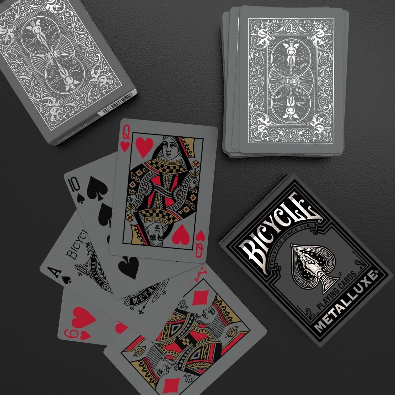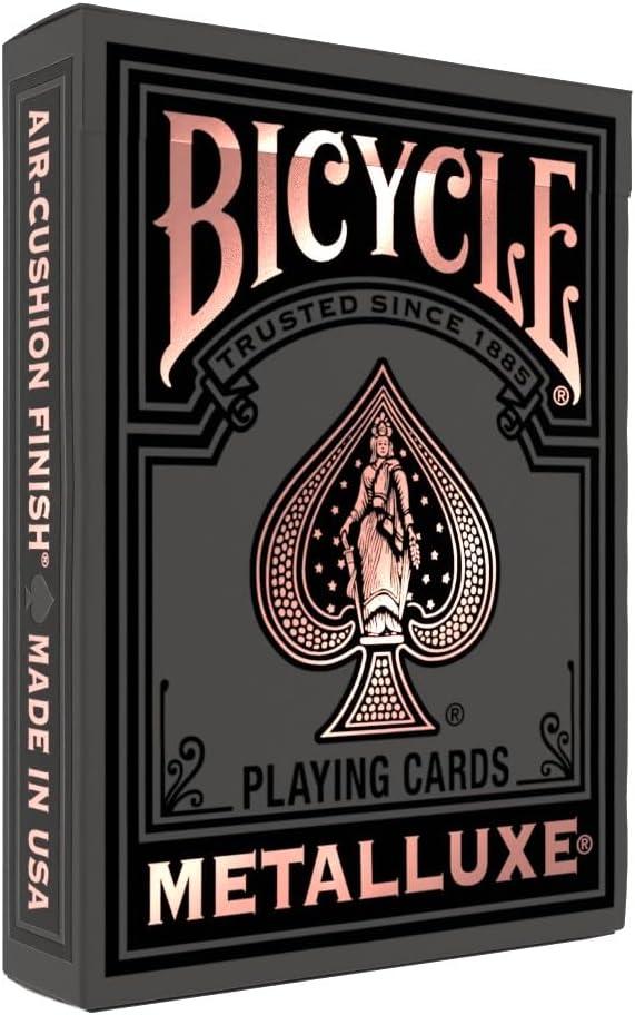 Experience the ultimate blend of style and performance with the Black and Rose Gold Metalluxe Playing Cards by Bicycle. Crafted with signature Metalluxe foil technology, this deck shimmers with elegant rose gold detailing on a deep black background—turning every game night into a luxury experience. Designed for poker players, magicians, cardists, and collectors, these cards offer both premium looks and trusted functionality. The air-cushion finish ensures smooth handling, perfect shuffles, and crisp fans every time. Whether you're hosting high-stakes poker, performing mind-blowing card tricks, or gifting a card lover, this luxury playing card deck makes a bold statement. Made in the USA by Bicycle, the brand known and loved for generations.