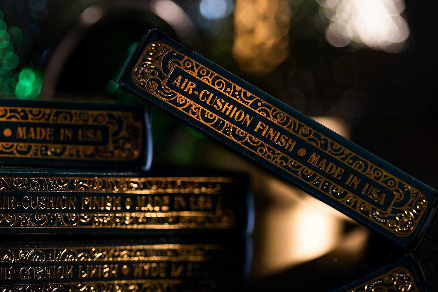 Custom-designed tuck, court cards, and card backs. Featuring a luxurious gold foil and embossing on the tuck and dark blue and gold designs in the deck.