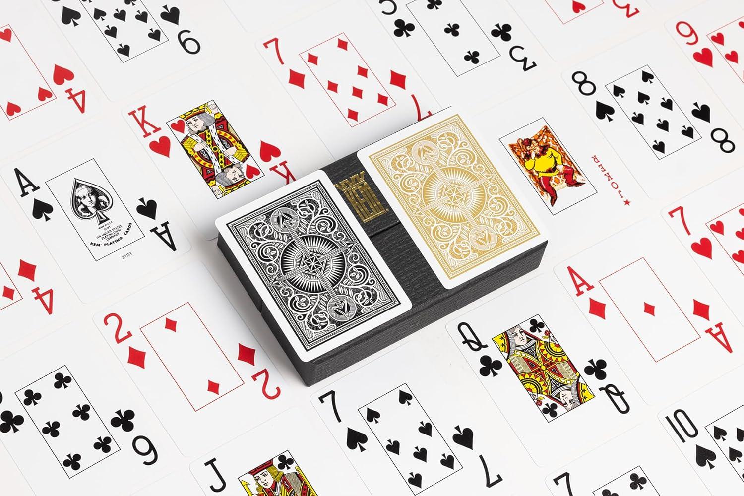 Our twin pack of jumbo index, KEM Arrow Black and Gold Playing Cards enhances your game nights with their distinctive size and clarity. Crafted from 100% cellulose acetate plastic, these cards harmoniously marry the traditional feel of paper and the robust longevity of plastic, making them an excellent addition to game nights. The decks, consisting of one black and one gold, not only exude superior flexibility and strength but also boast scuff and break resistance, capable of withstanding intense play sessions. Each card offers casino-grade quality, promising a truly professional gaming experience whether playing poker, black jack, or bridge. Housed in a premium paperboard box and made with exceptional quality that caters to lovers of fine card games, our KEM playing cards offer a unique experience that combines accessibility with the thrill of the game.